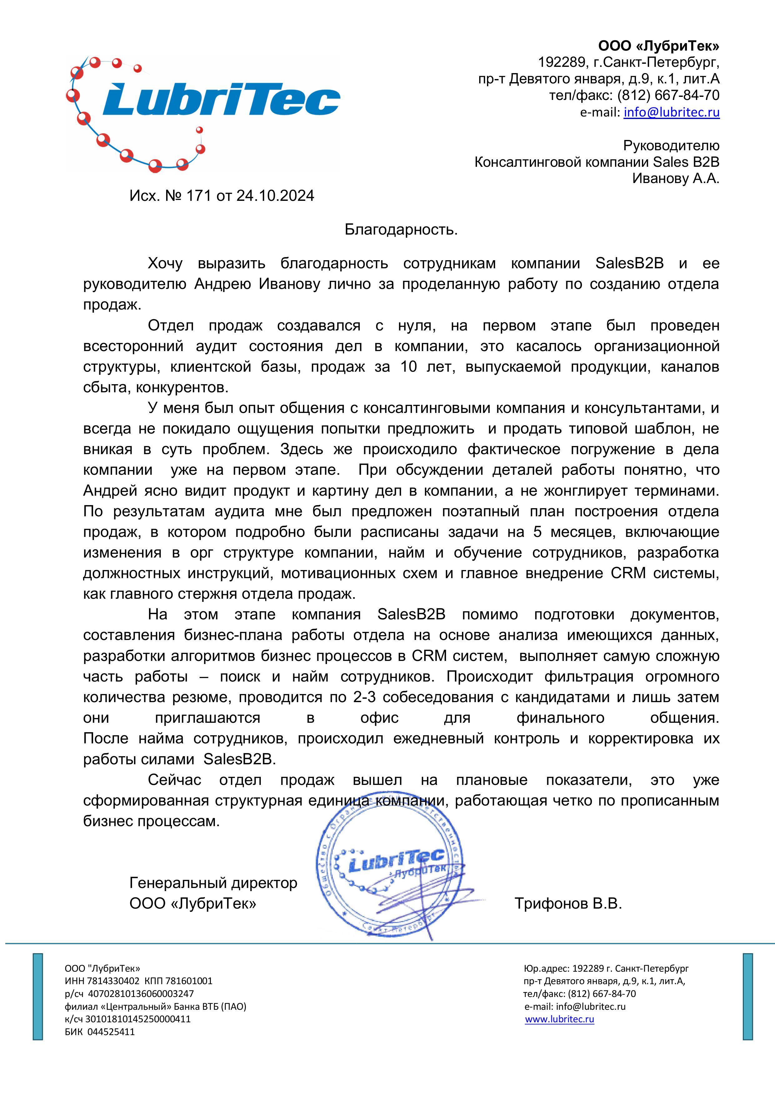 "Выражаю благодарность за предоставленный нам опыт и рабочие материалы при проведении изменений в работе отдела продаж, что помогло нам повысить эффективность: